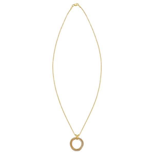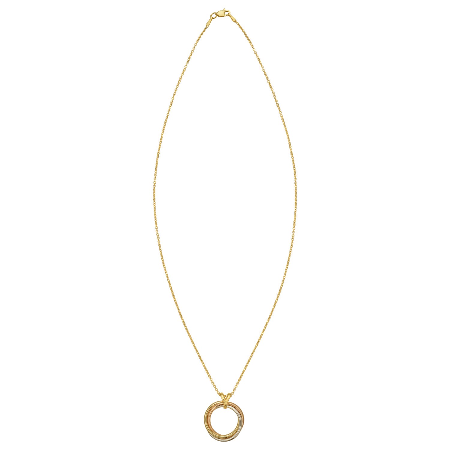 This elegant necklace features a 14K tri-color gold pendant with three interlocking polished rings, symbolizing unity and harmony. Suspended on an 18 inches yellow gold chain secured with a lobster clasp, it offers both style and comfort. Perfect for adding a touch of sophistication to any ensemble.
