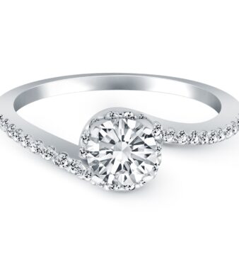 Positively elegant, this pronged round diamond ring features pave set shank stones with milgrain border detailing and baroque inspired sections. An antique set beauty made of 14k white gold.