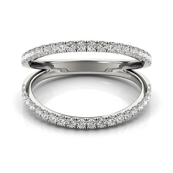 Utterly stunning in 14k white gold, this ring features pave set diamonds. A delightful beauty with a fashionable dual band design.