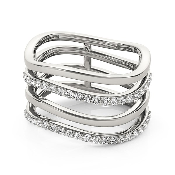 This ring designed with four wavy bands with alternating diamond-bedecked and polished styles made of 14k white gold.