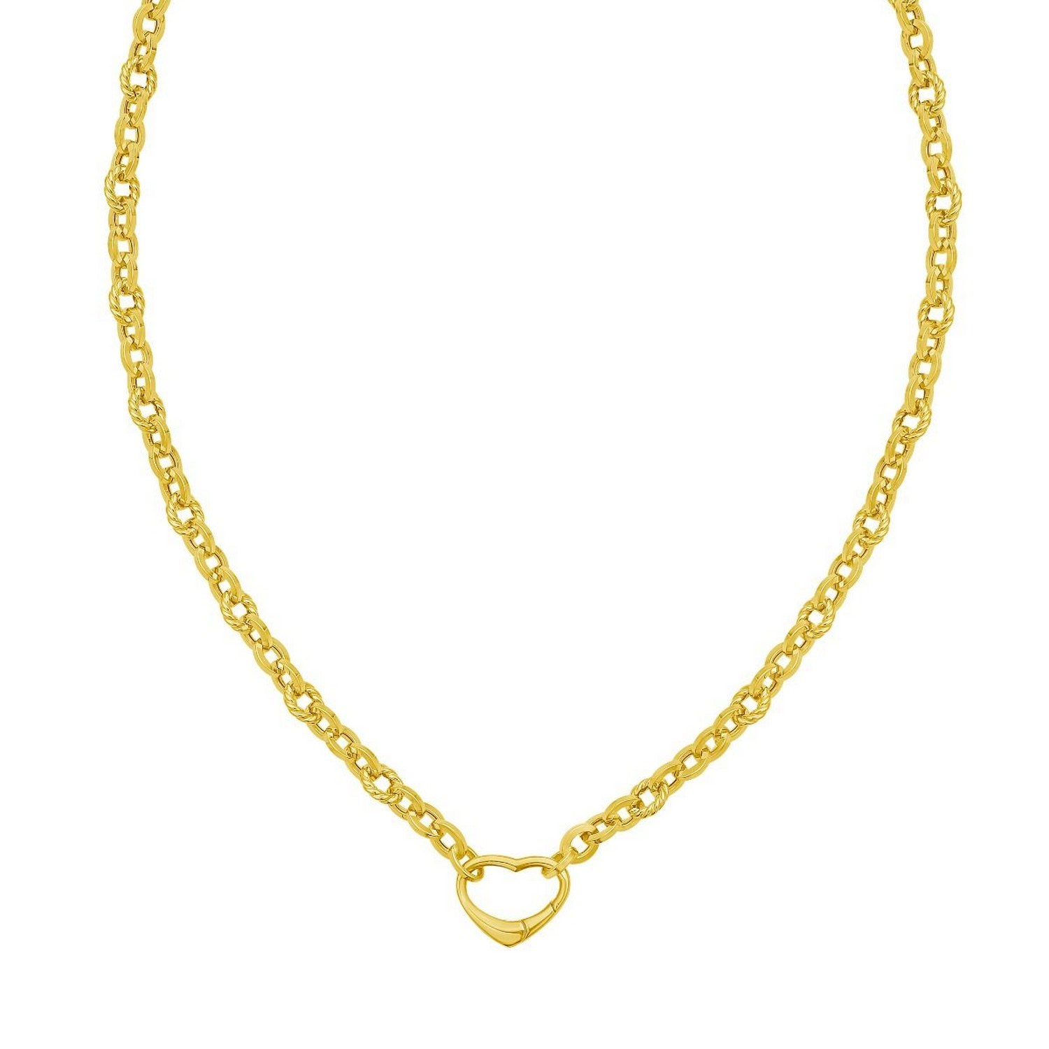 Express your love with this 14K yellow gold heart lock charm necklace. The 18 inches chain features a polished heart-shaped clasp that opens to allow the addition of personal charms, making it a versatile and meaningful accessory. Perfect for gifting or as a cherished piece in your own collection, this necklace combines elegance with personalization.