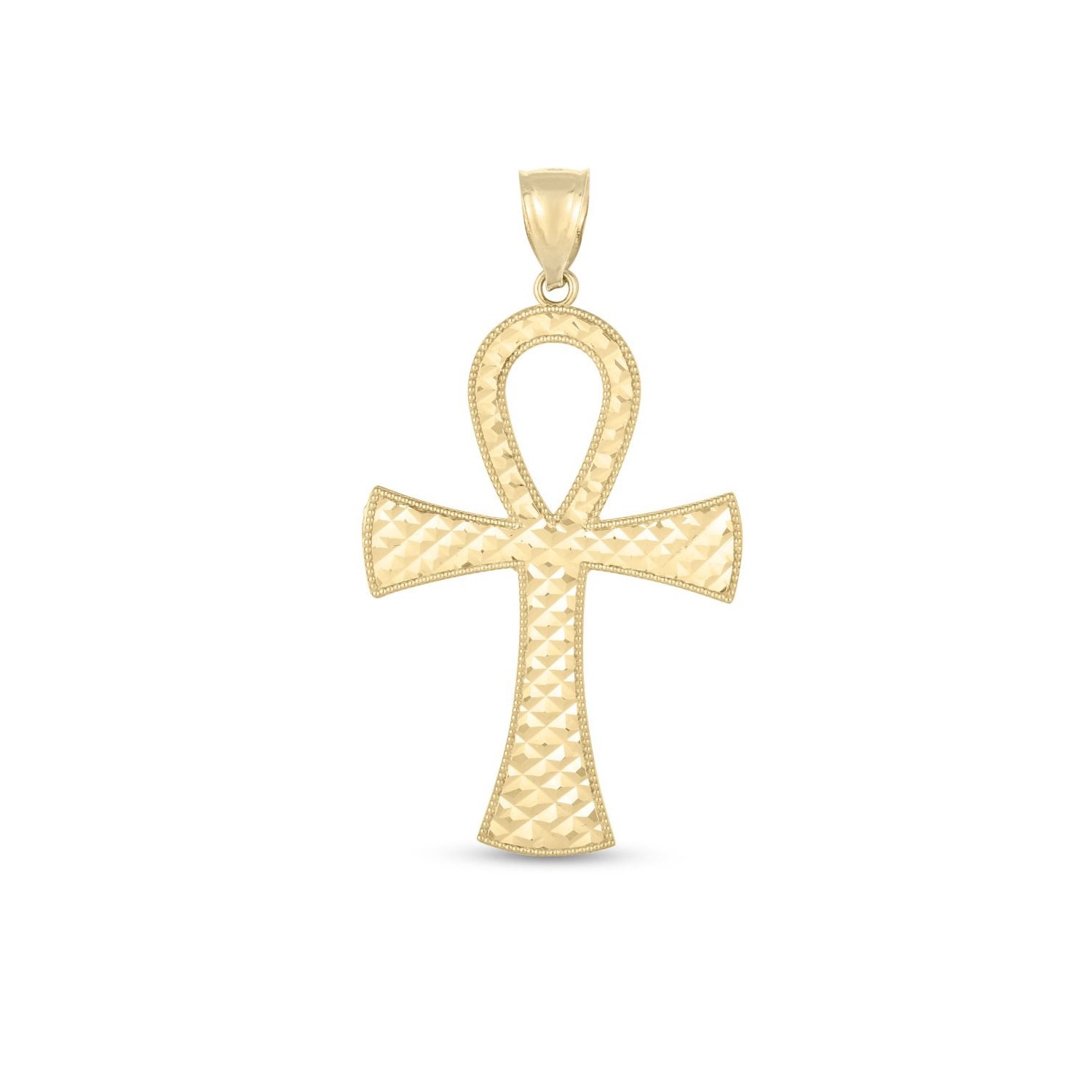 This highly fashionable Textured Ankh Pendant is crafted in 14k yellow gold with a high polish finish & hangs from a sleek bail. Perfect for pairing with any basic chain.