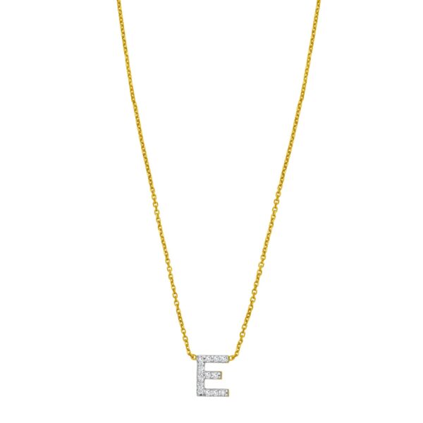 Celebrate individuality with this 14K yellow gold mini diamond E initial pendant. Adorned with sparkling round diamonds, this dainty yet elegant piece adds a personal touch to any look. Perfect for everyday wear or as a thoughtful gift, it comes with an 18 inches chain and a secure spring ring clasp for lasting beauty and comfort.
