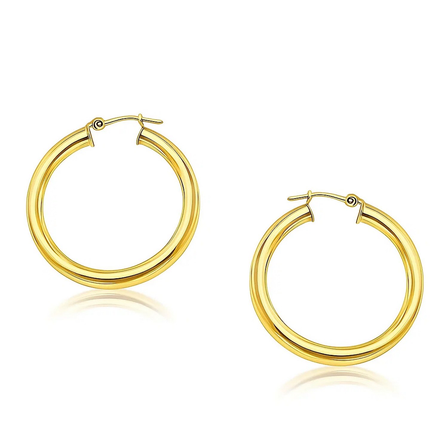 These timeless hoop earrings crafted in 14k yellow gold and measure 30 millimeters in diameter, featuring a snap lock backing.