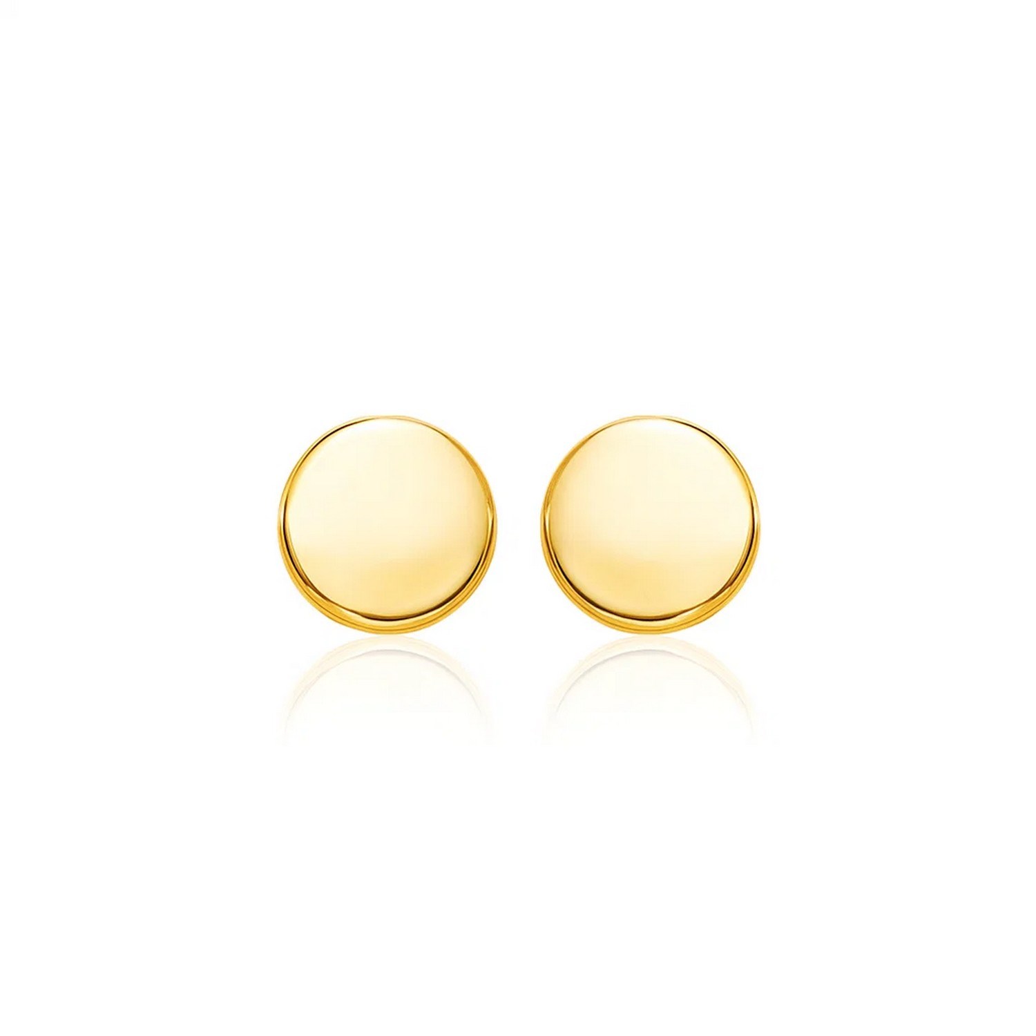 These shiny, polished 14k yellow gold circle post earrings are simple yet classic and dramatic. Post earrings are 5.5mm in diameter and are held in place by pushback clasps.