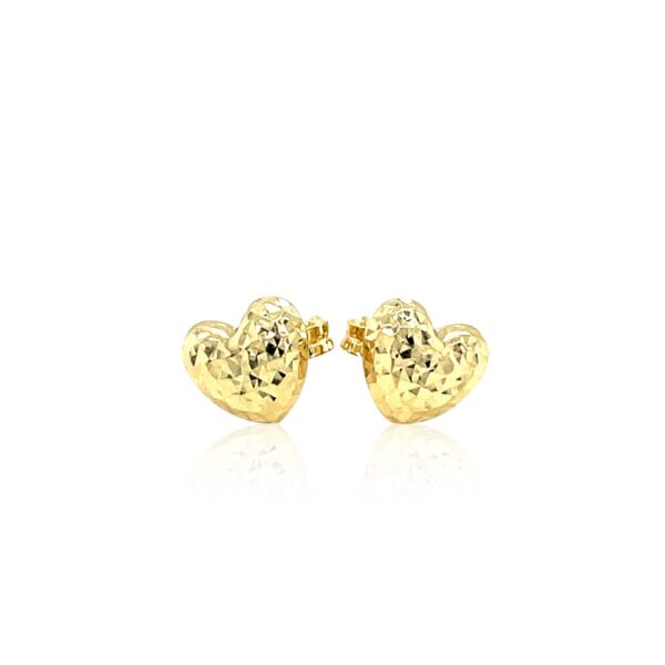 Stunning diamond cut texture detailing highlights the charming style of these puffed heart post earrings. Made of 14k yellow tone gold, these are secured with push backs.