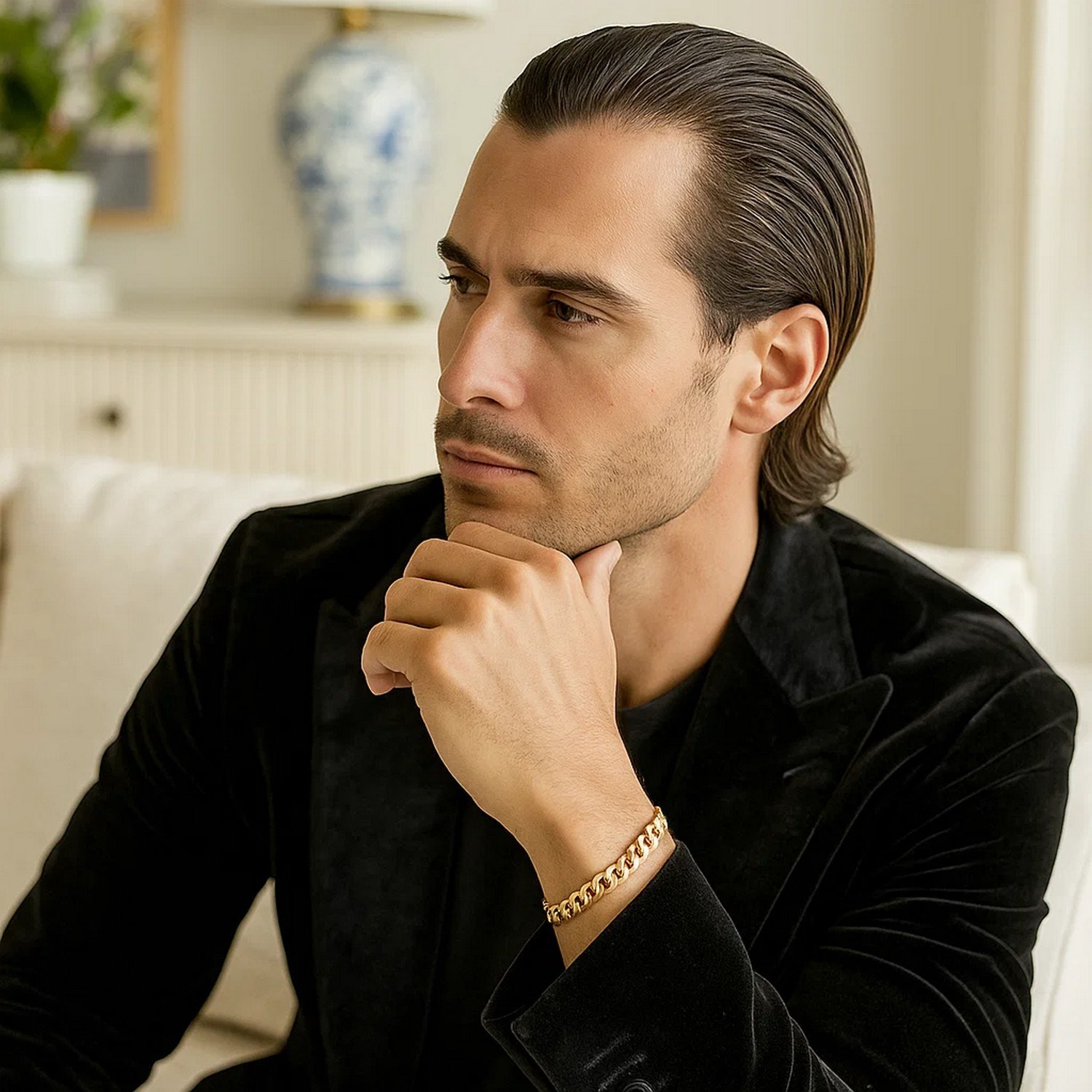 This solid curb bracelet comes in 14k yellow gold and has a width of 8.2 millimeters. Secured with a lobster clasp.