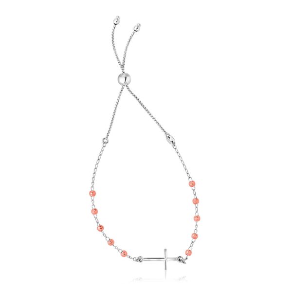 Sterling Silver White and Rose Finish Adjustable Bracelet with Cross (1.20 mm)